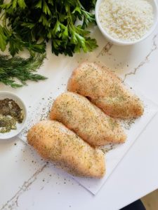 - Season both sides of the chicken with garlic powder, onion powder, salt, black pepper and dried herbs