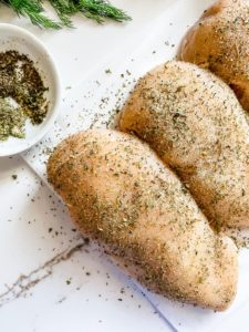 Season both sides of the chicken with garlic powder, onion powder, salt, black pepper and your favorite dried herb mix.