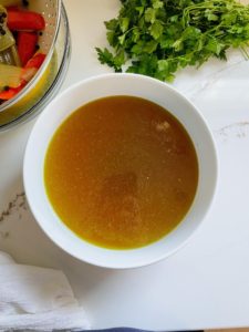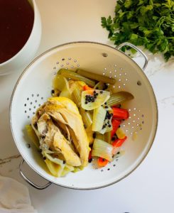 Once the chicken is cooked through and the stock is flavorful, remove the pot from the heat and place a strainer over a second pot in your kitchen sink.