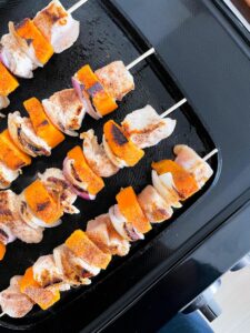 - Once the pan is warm, place the skewers down leaving a little bit of space between each one