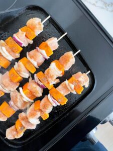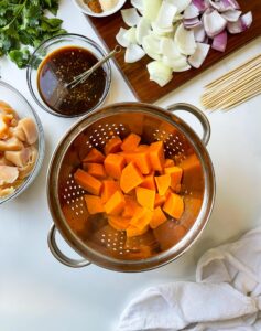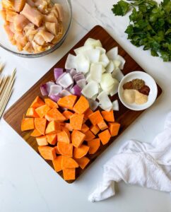 Once the sweet potatoes are cool enough to touch, assemble your skewers by alternating pieces of chicken, sweet potato and onion.