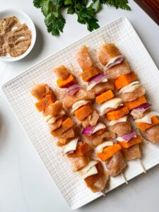 - Once the sweet potatoes have cooled enough to touch, assemble the skewers alternating between the chicken, sweet potatoes and onions