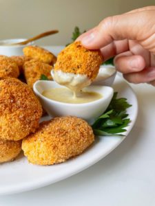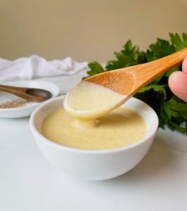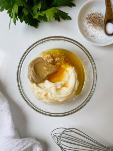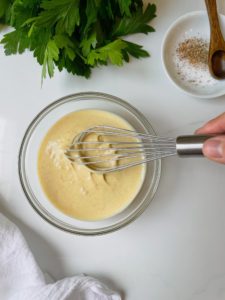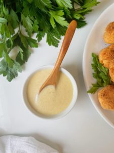 This recipe is super simple! Combine 1/2 cup of plain greek yogurt or a good quality mayonnaise (I love Duke’s mayonnaise!) with 3 tablespoons of dijon mustard, 2 tablespoons of honey, 1 tablespoon of olive oil, 1 tablespoon of apple cider vinegar, 1 clove of finely minced garlic and a pinch of salt and black pepper in a small dish.