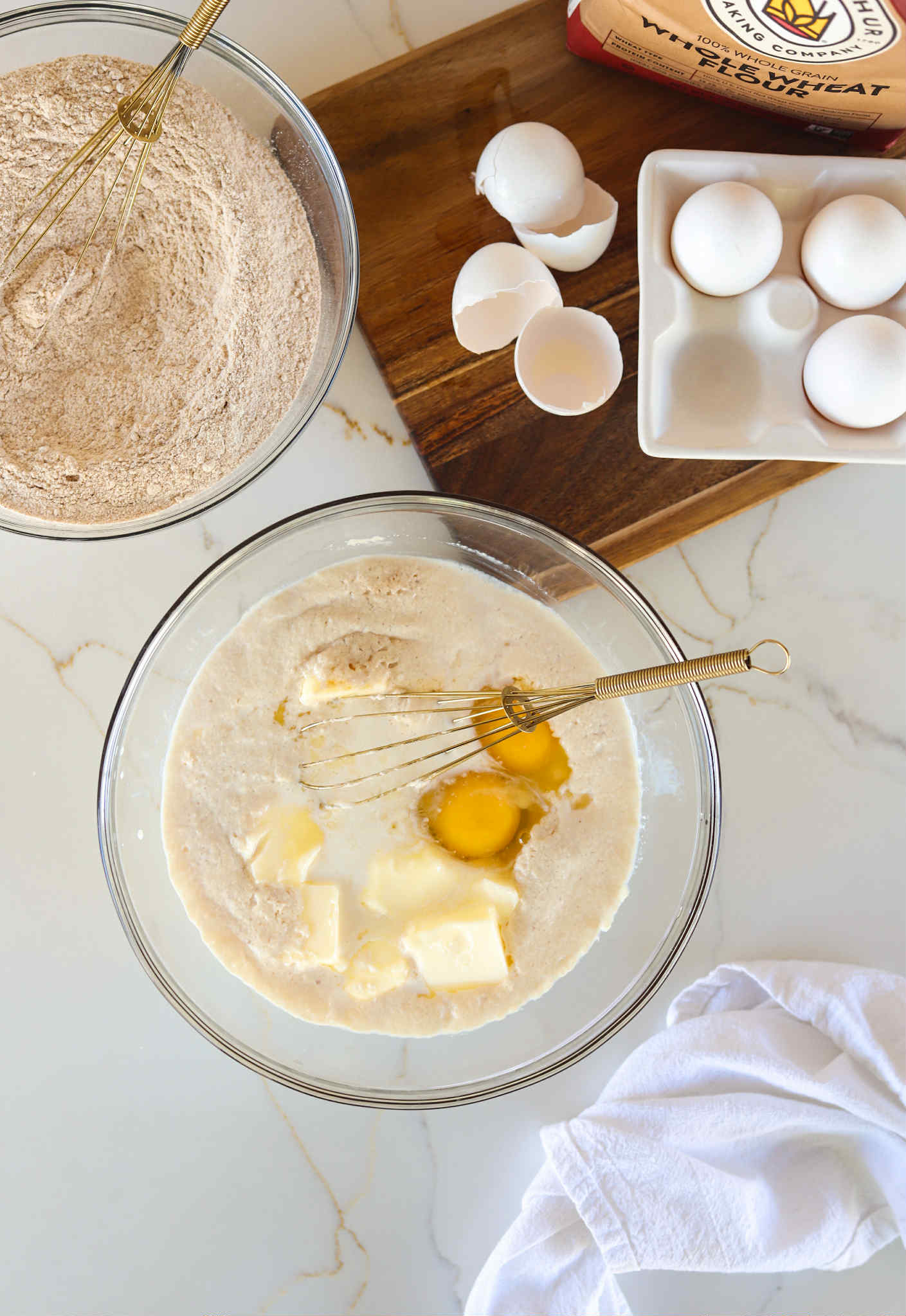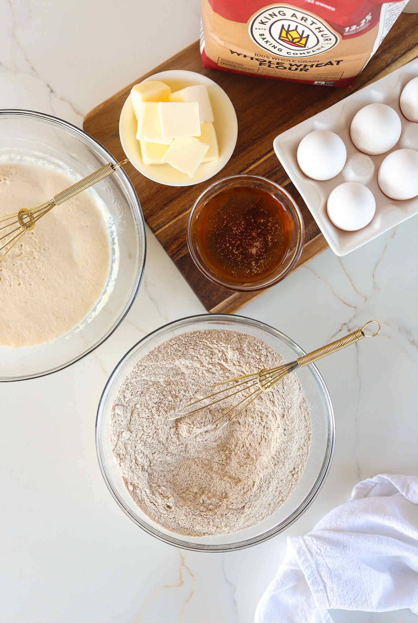 - Once the yeast has bloomed, whisk in 113 grams of softened salted butter, 2 large eggs and the remaining honey (115 grams of honey total)