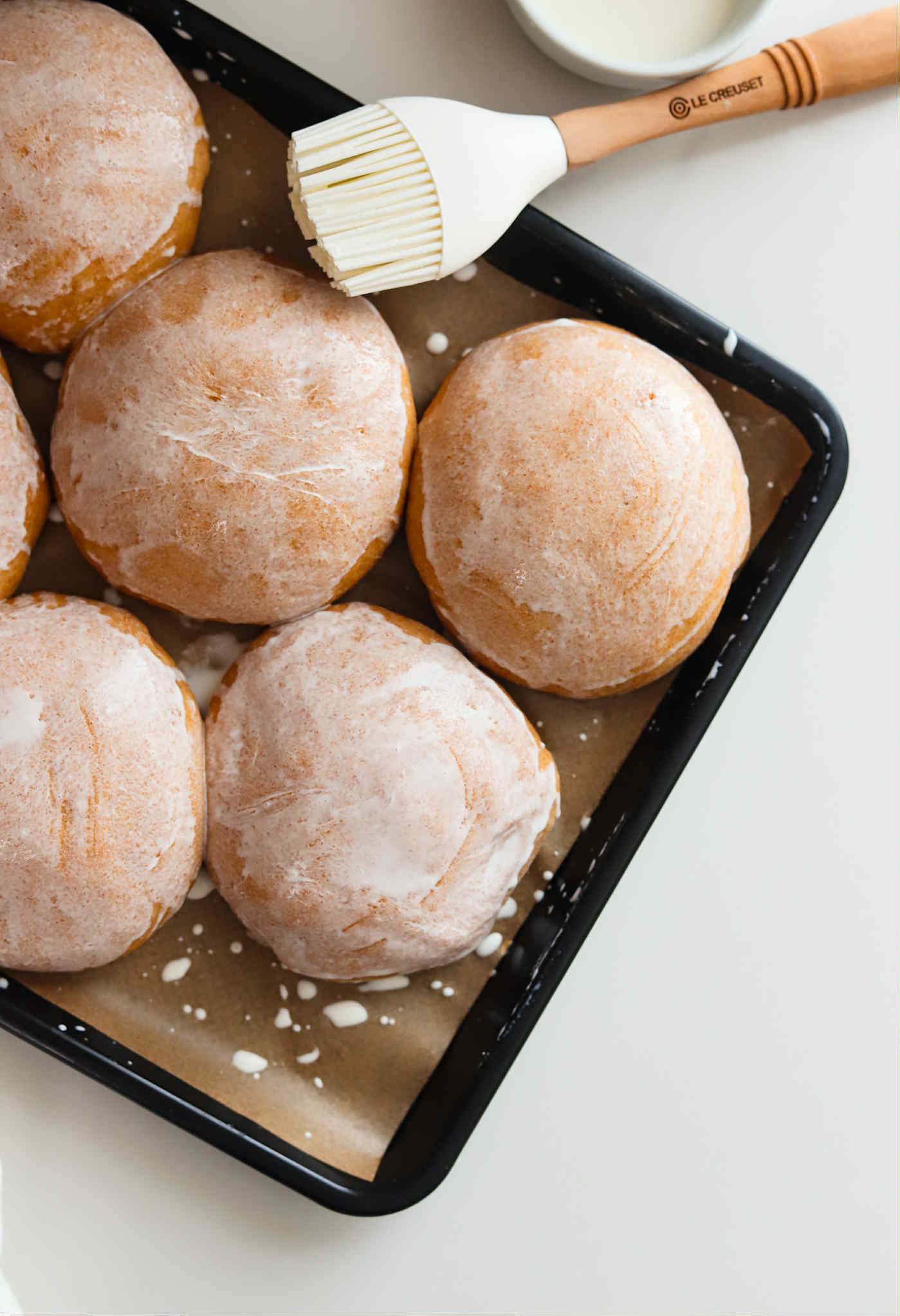 Note: If you want the tops of your buns to be shiny (or if you want to add sesame seeds, nuts or oats), gently brush the tops of the buns with an egg wash (1 egg whisked with a teaspoon of water). If you want a thin, more matte finish crust, you can brush them with heavy cream or you can bake them without brushing anything on them at all!