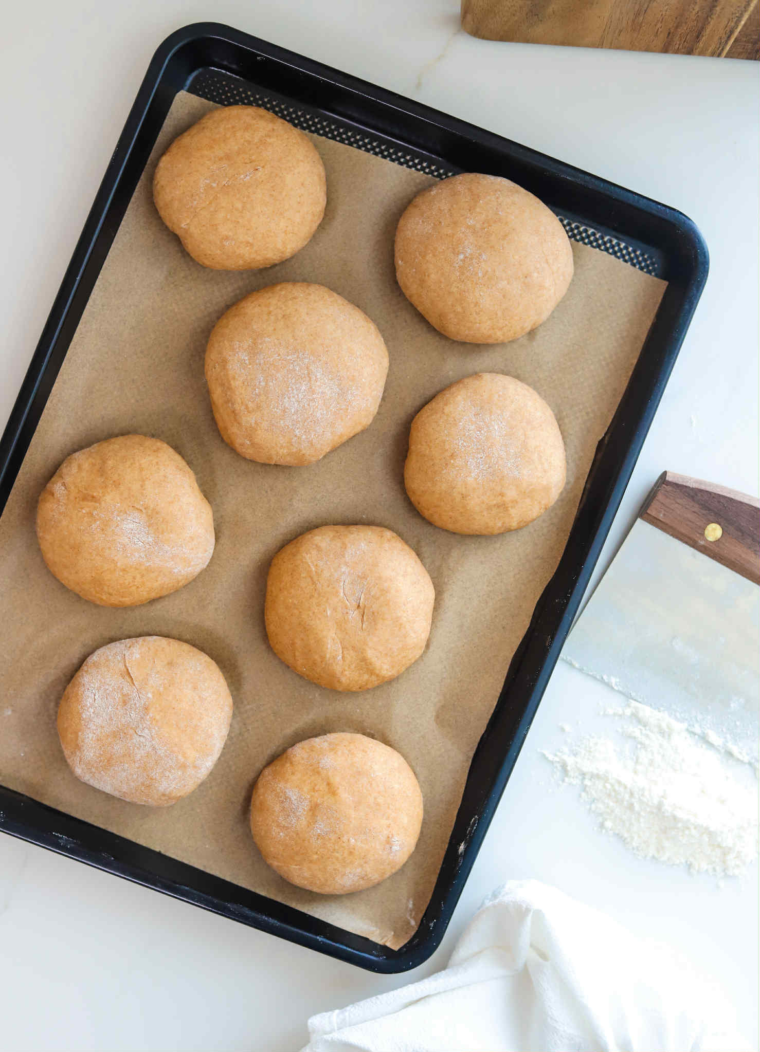 Transfer the shaped dough onto a parchment lined baking sheet, cover with a kitchen towel and let the rolls rest in a warm spot for about an hour.