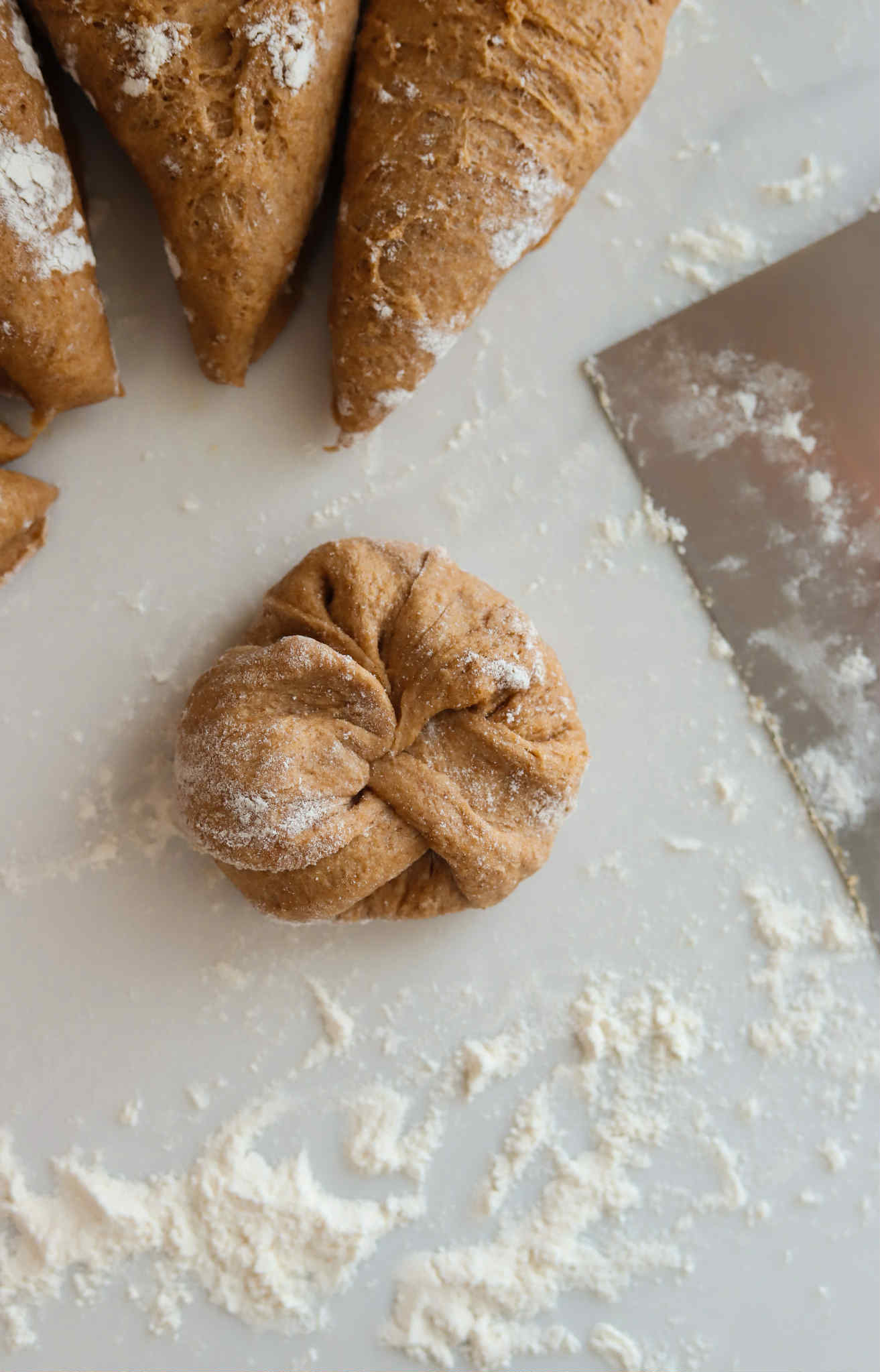 - Shape each portion into round balls by pulling the outer edges into the center and pinching then together on the underside of the ball (see photo above)