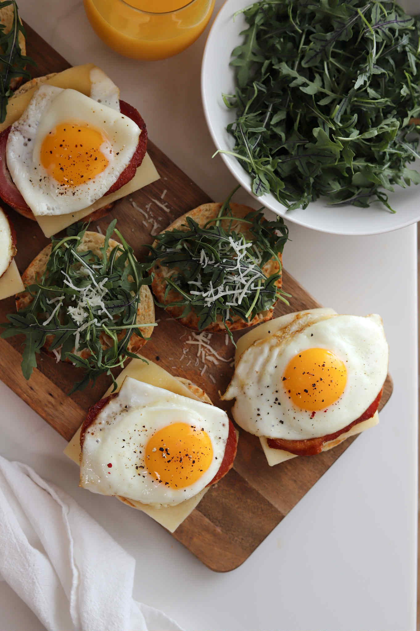 Crispy salty pancetta layered with melted havarti, sunny side up eggs and baby arugula on fluffy english muffins.