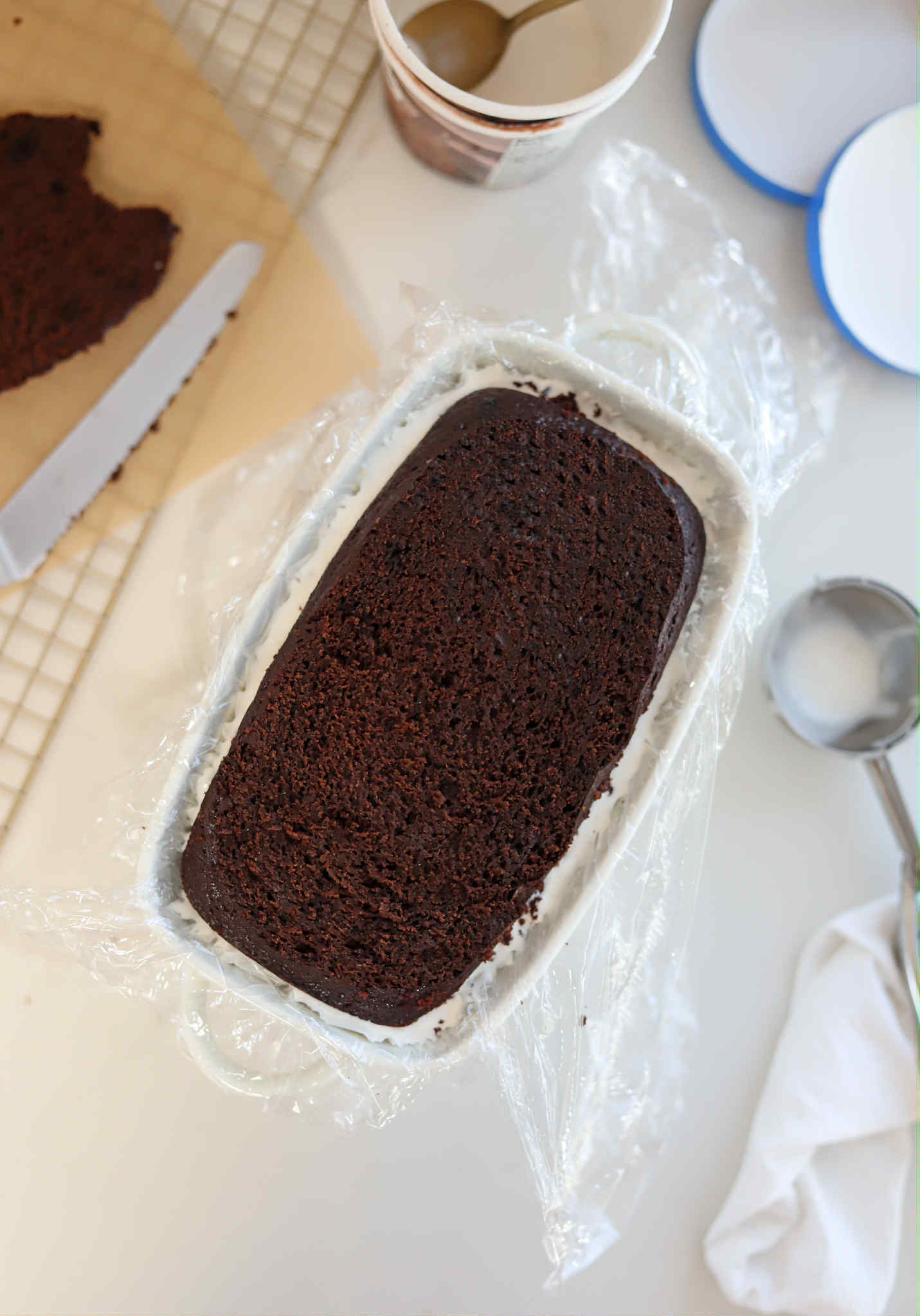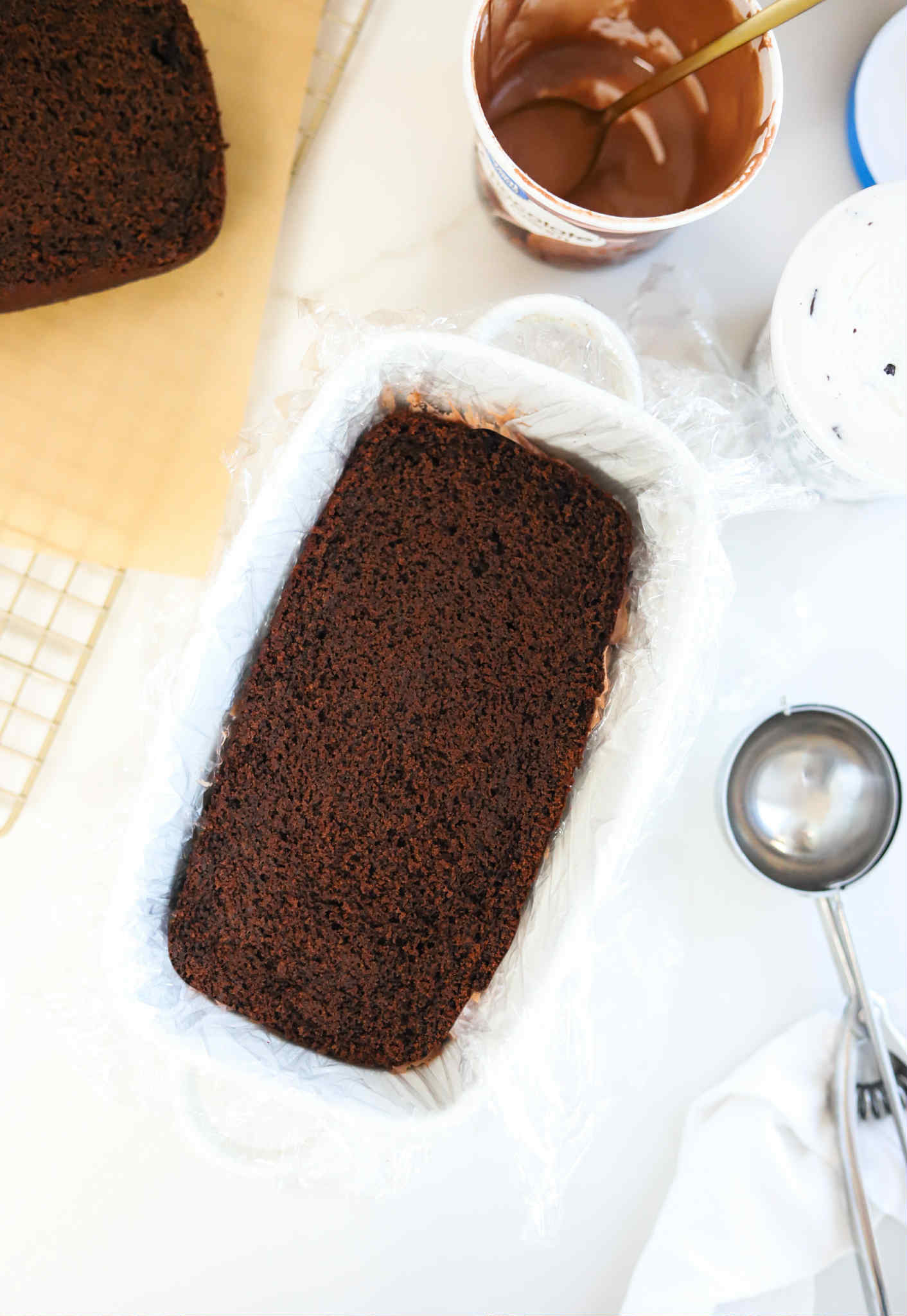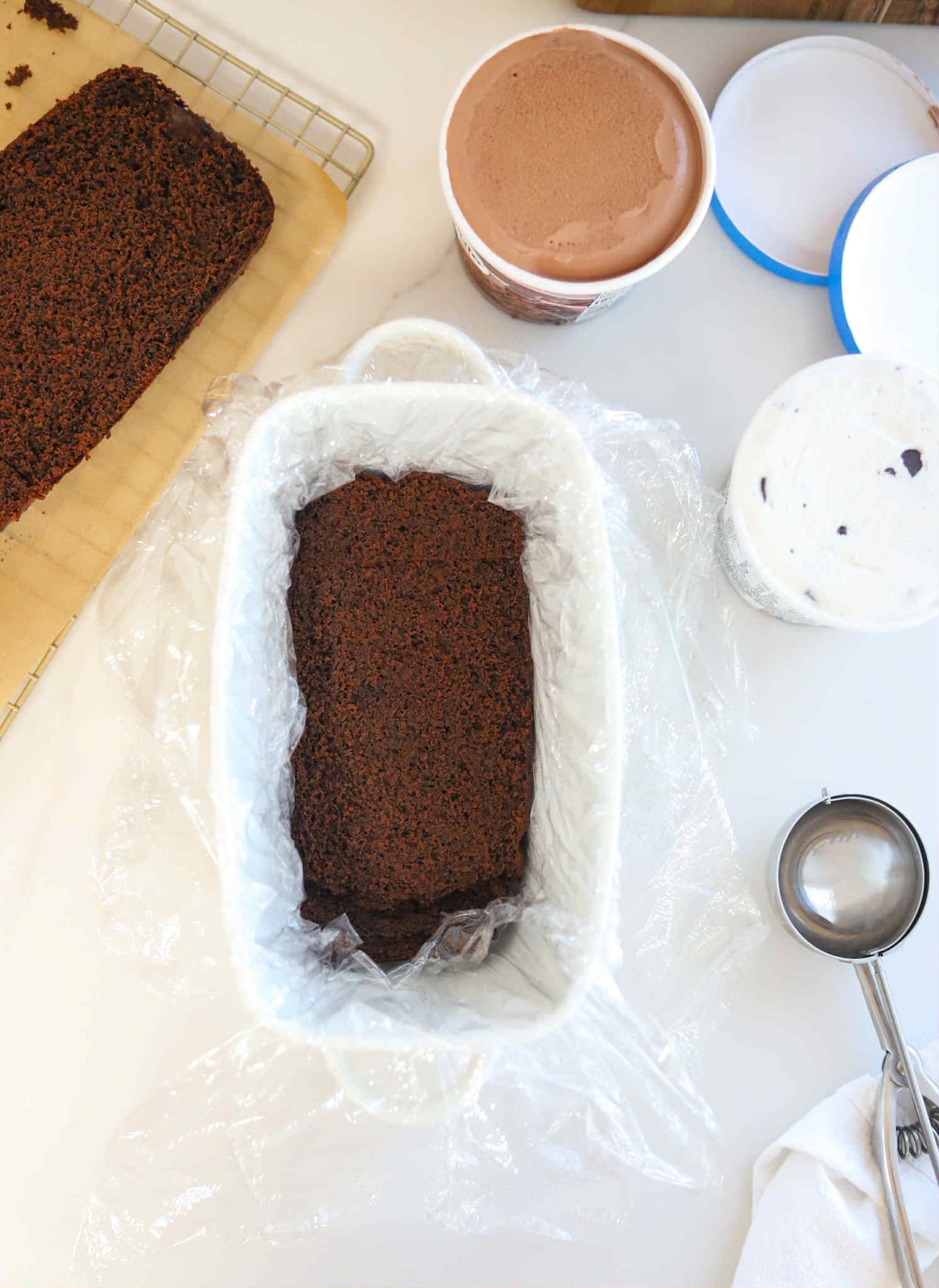- Lightly grease a loaf pan and line it with sheets of plastic wrap that hang over all four sides enough to completely cover the top of the cake and give you enough to hold onto when it comes time to lift the frozen cake out of the pan