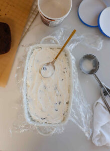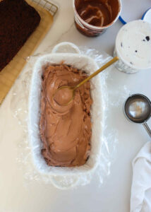 - When ready to decorate and slice, use the plastic wrap to lift the ice cream cake out of the loaf pan (since we greased the pan, it should not stick, but if it does, use a blow dryer to lightly warm the outside of the pan until the cake releases)