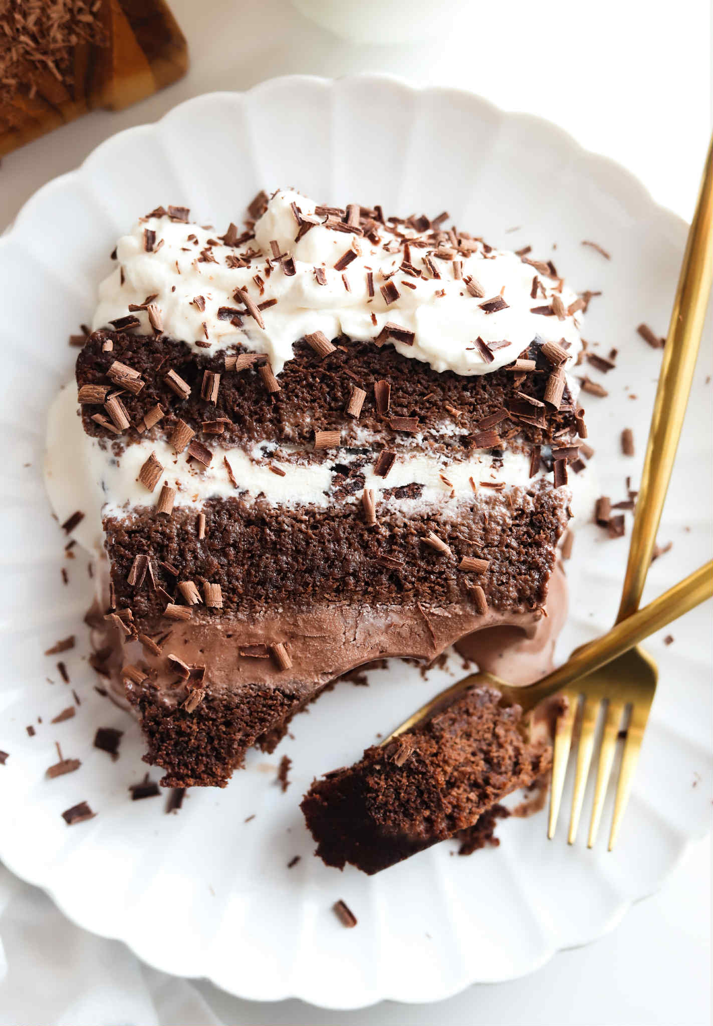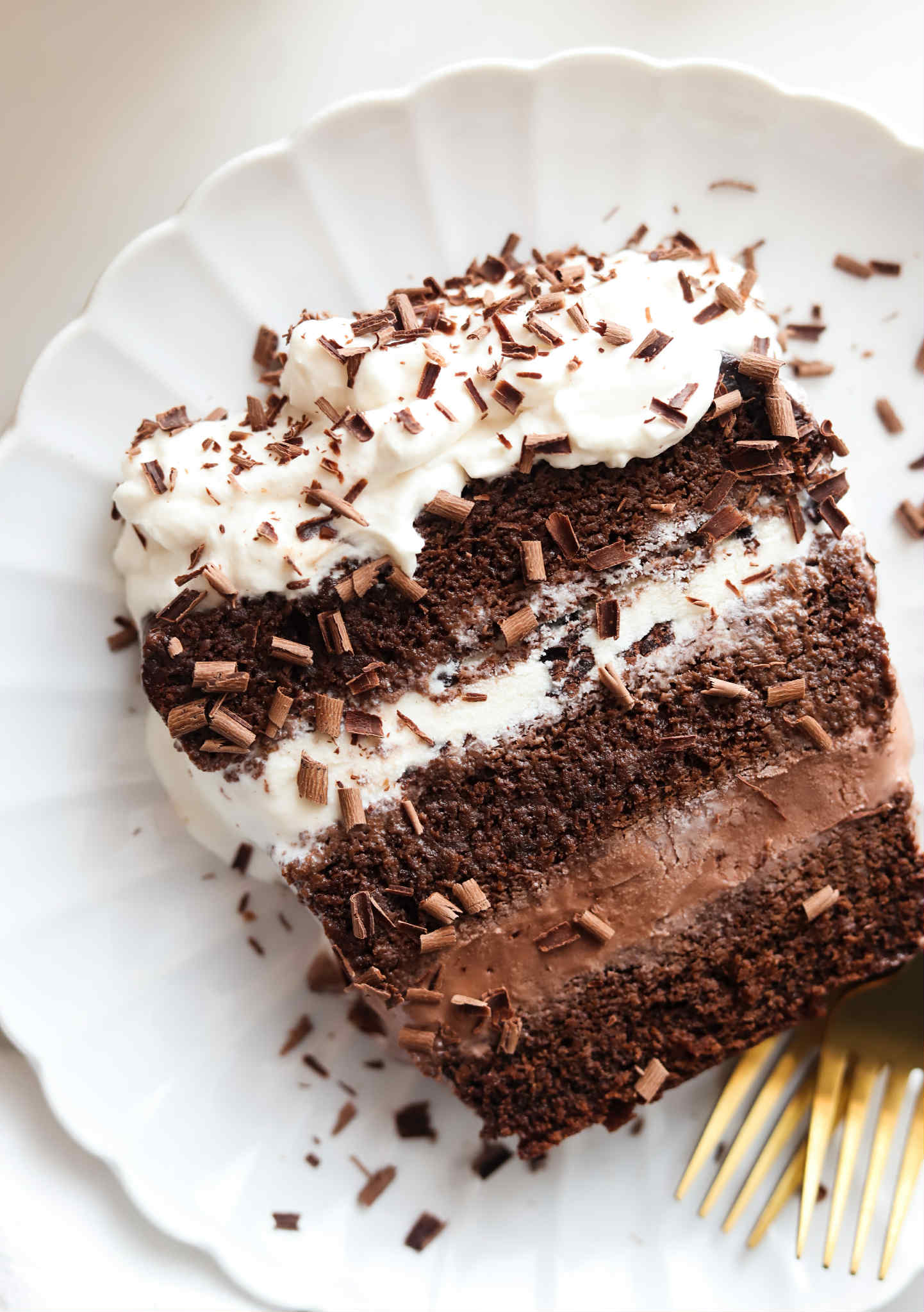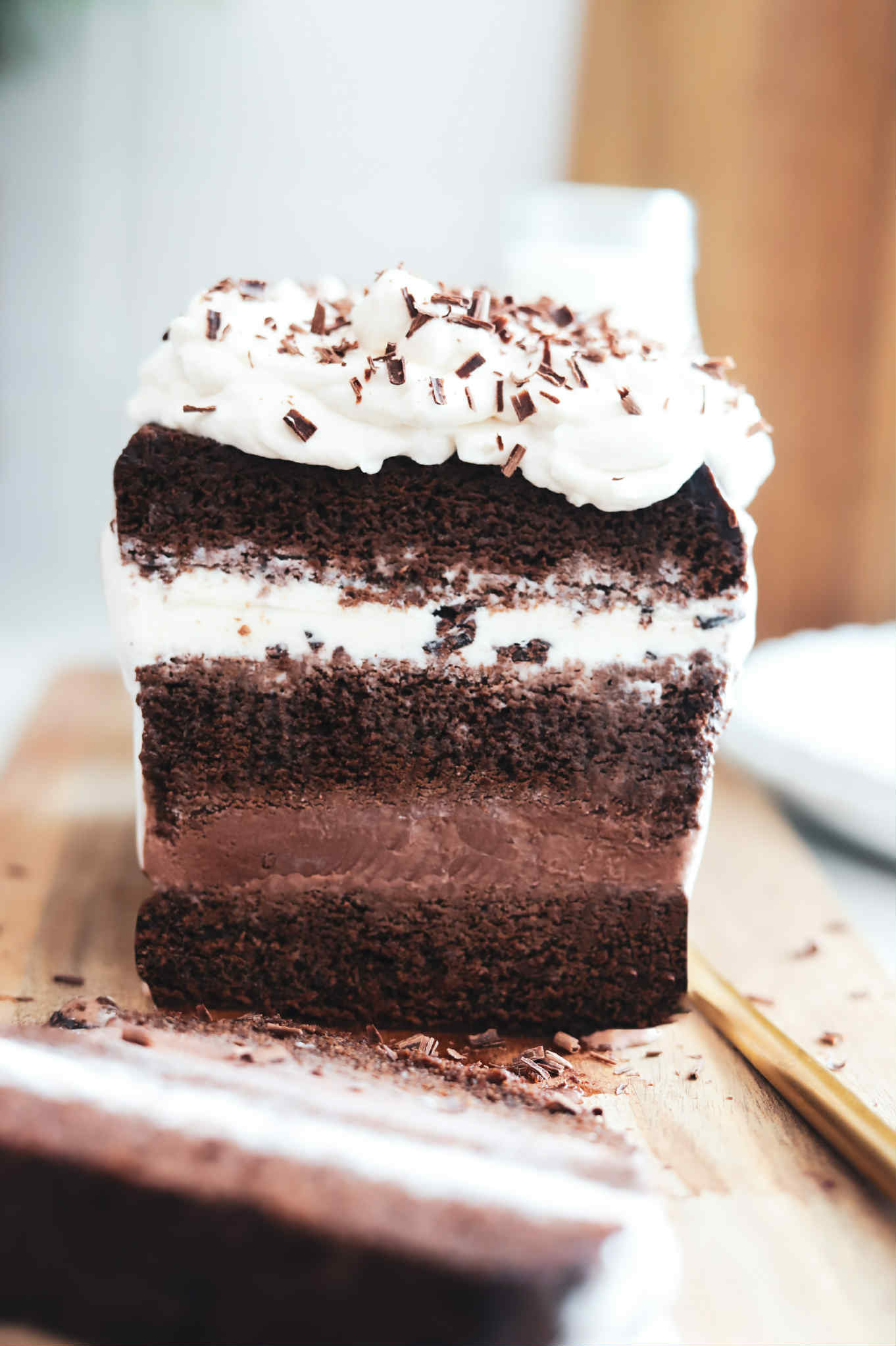 Would you just look at those layers? The cake layers soften up within a few minutes of taking a slice out of the freezer, so slice it up while everything is still firm and if you have any extra chocolate shavings or sprinkles laying around, toss them on the slices!