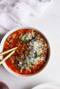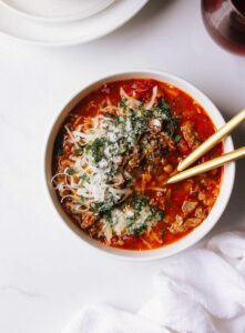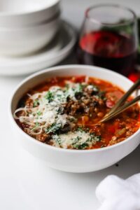 This Italian lentil soup is full of vegetables, fire roasted tomatoes, herbs, parmesan cheese, Italian sausage and, of course, lentils. It is hearty, comforting and absolutely delicious. One of those soups that I can eat every night of the week and still be excited to reheat on the last night.