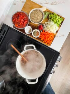 - Add 6 cups of chicken or beef stock, 30 ounces of fire roasted tomatoes, a bay leaf, 1 1/2 cups of brown lentils and an optional parmesan rind and bring the mixture to a simmer
