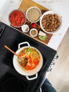 Add a diced yellow onion, 2 large peeled and diced carrots, 2 diced ribs of celery and 4 finely minced cloves of garlic into the pot, give it a good stir and cook for about 8 minutes or until the vegetables have started to soften.