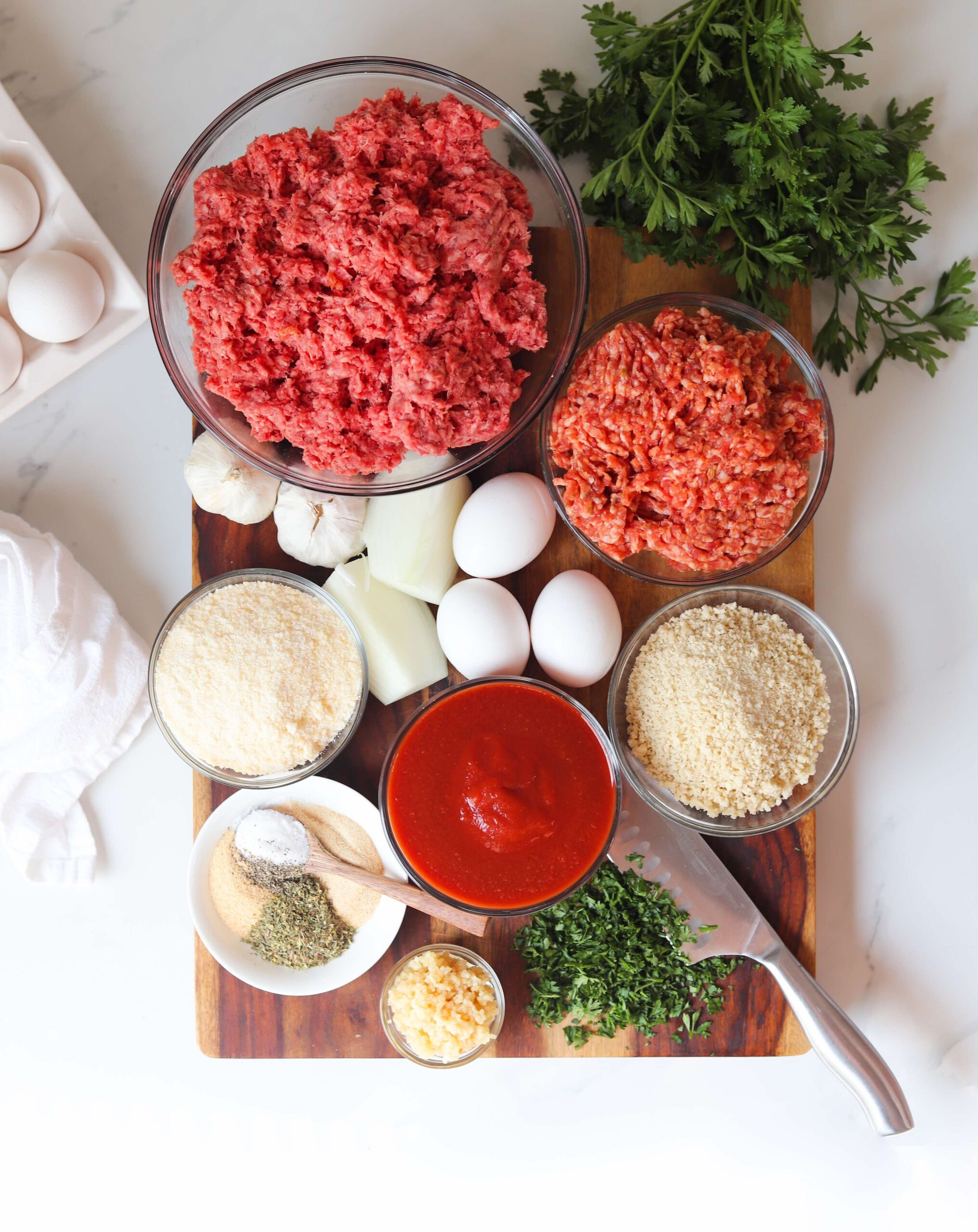 Grab a big mixing bowl and add 32 ounces of ground beef and 16 ounces of ground italian sausage along with the softened onion and garlic, 3 large eggs, 3/4 cup of breadcrumbs or crushed chicharrones, 3/4 cup of grated parmesan, 15 ounces of tomato sauce, 2 teaspoons of garlic powder, 2 teaspoons of onion powder, 2 teaspoons of dried italian herbs, 1 teaspoon of salt, 1/4 teaspoon of black pepper and 1/4 cup of finely chopped fresh parsley.