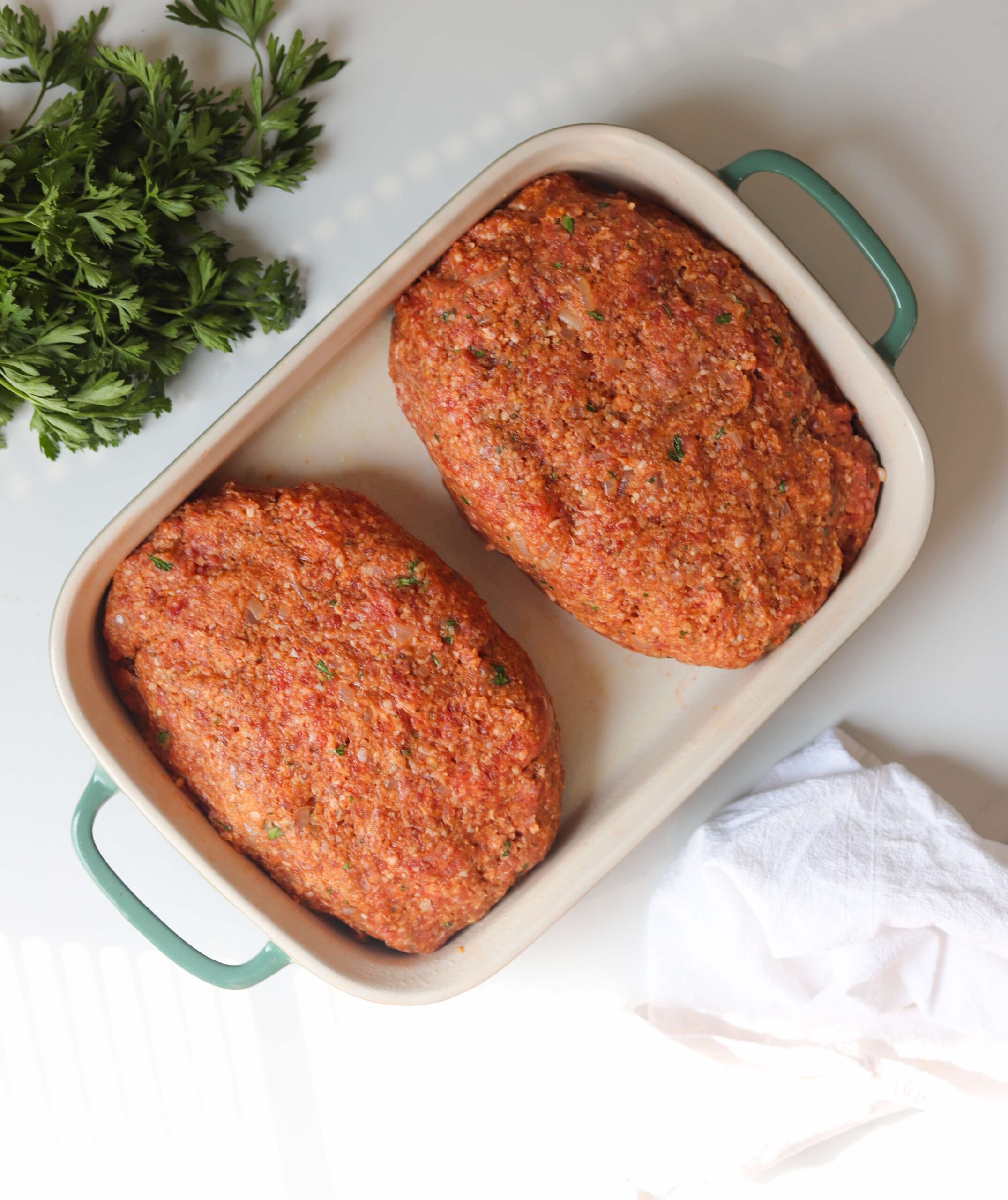 - Cake Pan – My preferred method is a 9″x13″ deep cake baking dish. Both meatloaves will fit inside of this dish and there will be just enough space to keep them together, but allow for maximum caramelization.