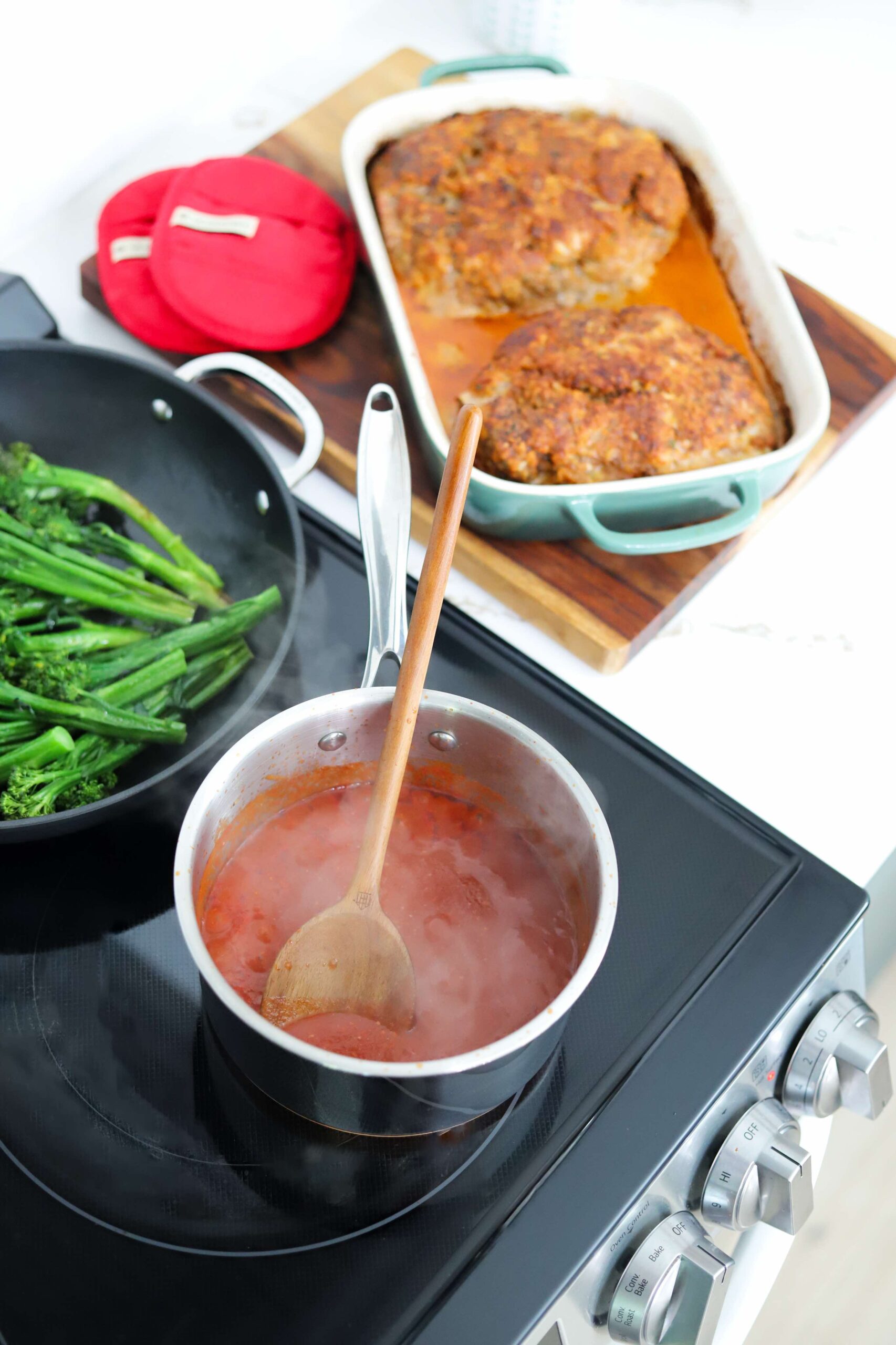- While the meatloaf is resting, add 15 ounces of tomato sauce into a saucepan placed over medium to medium low heat