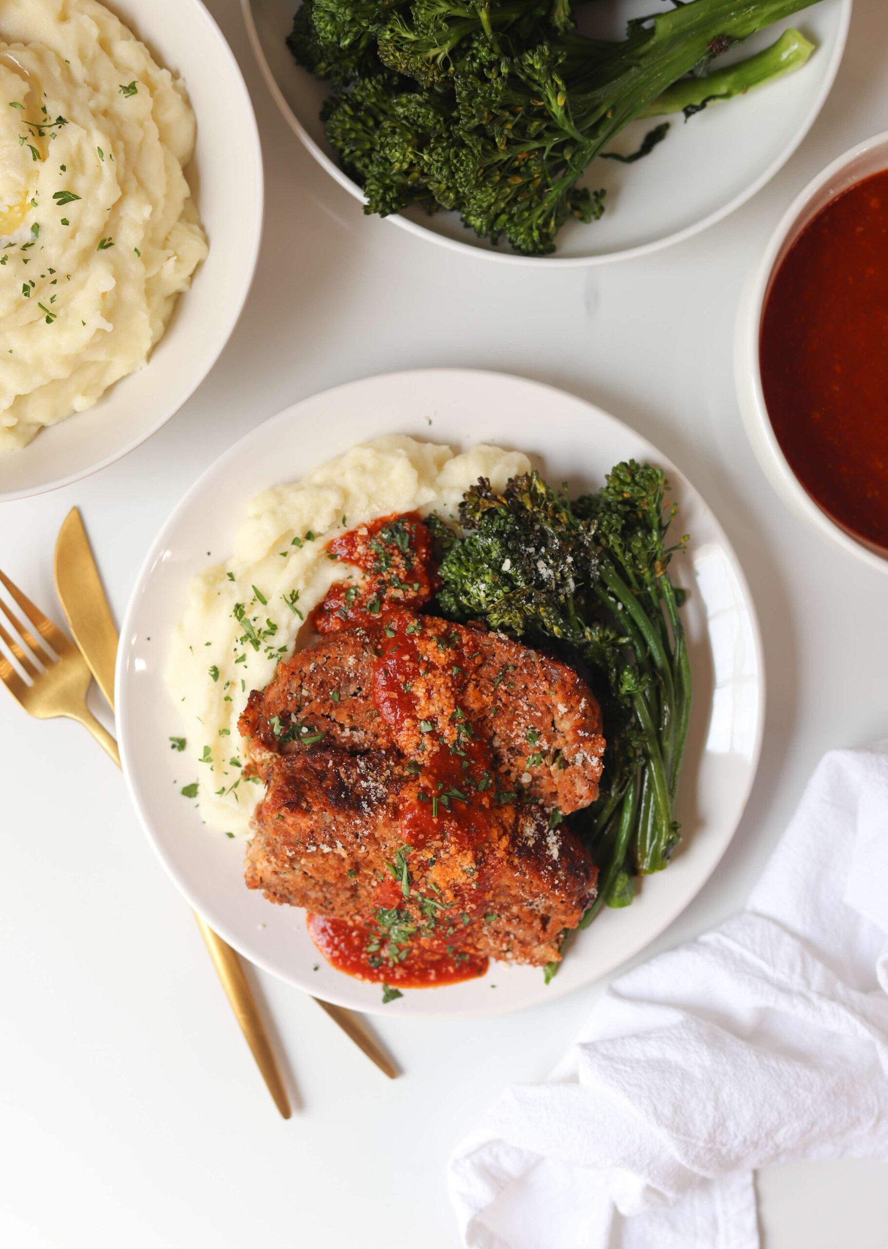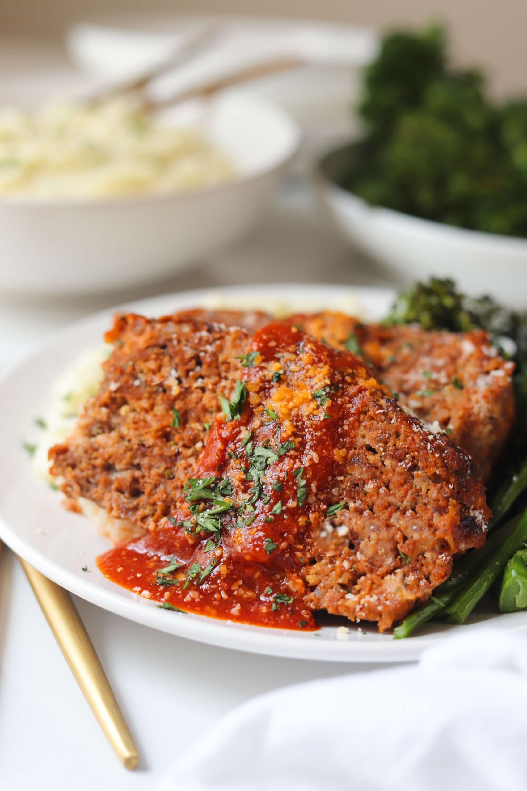 I have always served meatloaf with mashed potatoes and something green… either green beans, peas, roasted brussel sprouts or broccoli. There is something classic about meatloaf and mashed potatoes, so I am not even considering breaking those two up, but it really can be paired up with almost anything. Meatloaf is so versatile.