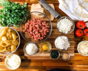 To bake up a big batch of stuffed shells, you will need 2 tablespoons of extra virgin olive oil, 1 medium yellow onion, 16 ounces of ground italian sausage, 14 ounces of jumbo shells, 15 ounces of whole milk ricotta, 1 large egg, 2/3 cup of finely shredded parmesan, 1/3 cup of finely chopped basil, 2 cloves of finely minced garlic, 24 ounces of marinara and 12 ounces of shredded mozzarella.