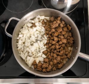 As the sausage cooks, break it up into really small pieces and once it is cooked through, transfer the sausage and onions into a large bowl and set it aside to cool a bit while you cook the shells.