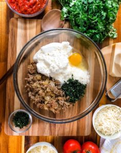 - Add 15 ounces of whole milk ricotta, 1 large egg, 2/3 cup of finely shredded parmesan, 1/3 cup of finely chopped basil and 2 cloves of finely minced garlic to the italian sausage and onions and mix until everything is fully incorporated