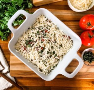 - Cover the entire dish with shredded mozzarella