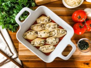 *Note: The easiest way to fill the shells is to transfer the filling into a large piping bag or gallon zip lock bag, cut the tip off and squeeze the filling right into the shells. You can certainly do this with a spoon, it just takes a little longer.