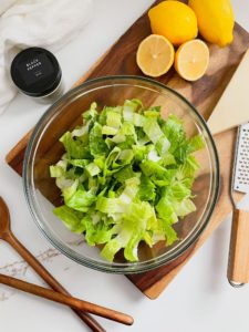 This recipe is super simple! Chop a head of romaine into bite sized pieces, wash it thoroughly and dry with paper towels. Place the lettuce in a large bowl and drizzle with about 2 tablespoons of a good olive oil. Toss the lettuce until all of the leaves are lightly coated in olive oil.
