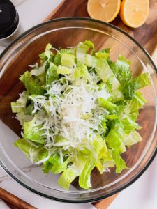 I love adding lemon zest to this salad. It really punches up the intensity of lemon flavors, so before I cut a lemon in half to juice it, I zest the outside right over the romaine and then squeeze in about 2 tablespoons of fresh lemon juice.