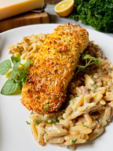 - In a shallow bowl, combine 1/2 cup of breadcrumbs, 1/2 cup of finely grated parmesan, 1 tablespoon of finely chopped parsley, 1 tablespoon of olive oil, 1 teaspoon of lemon zest, 1/2 teaspoon of garlic powder and a pinch of salt and black pepper