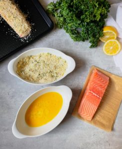 - Transfer the egg dipped salmon into the breadcrumb mixture and coat on all sides