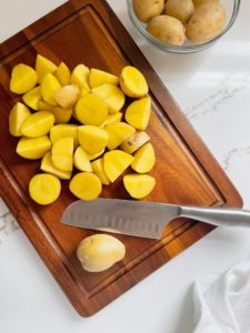 Begin by washing a 24 ounce bag of baby potatoes and slicing them into halves or quarters. Try to cut all of the potatoes into similar sizes so they all cook the same.