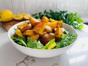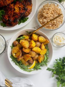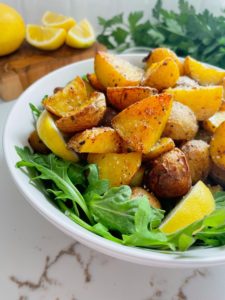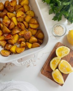 The lemon: You can add fresh lemon juice before you roast the potatoes, after they are roasted or both! It all depends on just how lemony you want your potatoes to be. If I am making these potatoes for myself and my husband, I will add the lemon before and after roasting, but if I am making these potatoes for guests, I usually serve some lemon wedges with the potatoes, so everyone can add their own.