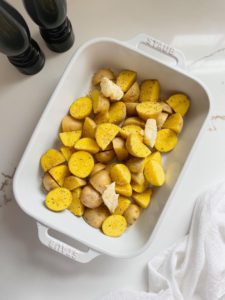 Transfer the potatoes into a deep baking dish large enough that they can be mostly in a single layer. I usually use my 7″x11″ Staub baking dish for these potatoes and it works great.