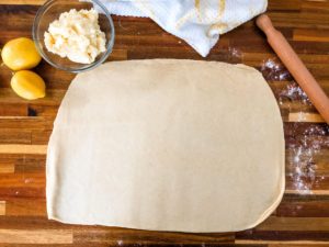 • Transfer the dough on a lightly floured surface and roll it out into a large rectangle that is less than 1/4 inch thick throughout