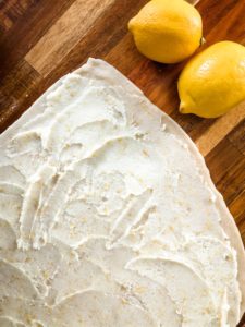 Once your dough is rolled out, evenly distribute all of the lemon sugar filling over the entire surface of the dough. Be sure to work it close to the edges, so the rolls cut from the ends have some of that fabulous filling too.