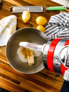 While the dough is resting, make your lemon sugar filling by combining 14 tablespoons of room temperature butter with 1 1/3 cup of granulated sugar, 1 heaping tablespoon of fresh lemon zest and few drops of lemon extract in the bowl of your stand mixer. Using a paddle attachment, cream the ingredients together until they are smooth and everything is fully incorporated.