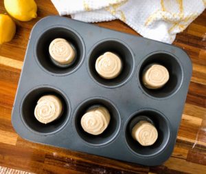 Transfer the sweet rolls into greased muffin tins. If you went with the standard sized rolls, they fit perfectly into standard sized muffin tins (the ones with 12 muffin cups), but if you decided to cut out taller rolls, I suggest putting them into larger muffin tins, so they have more room to spread out.