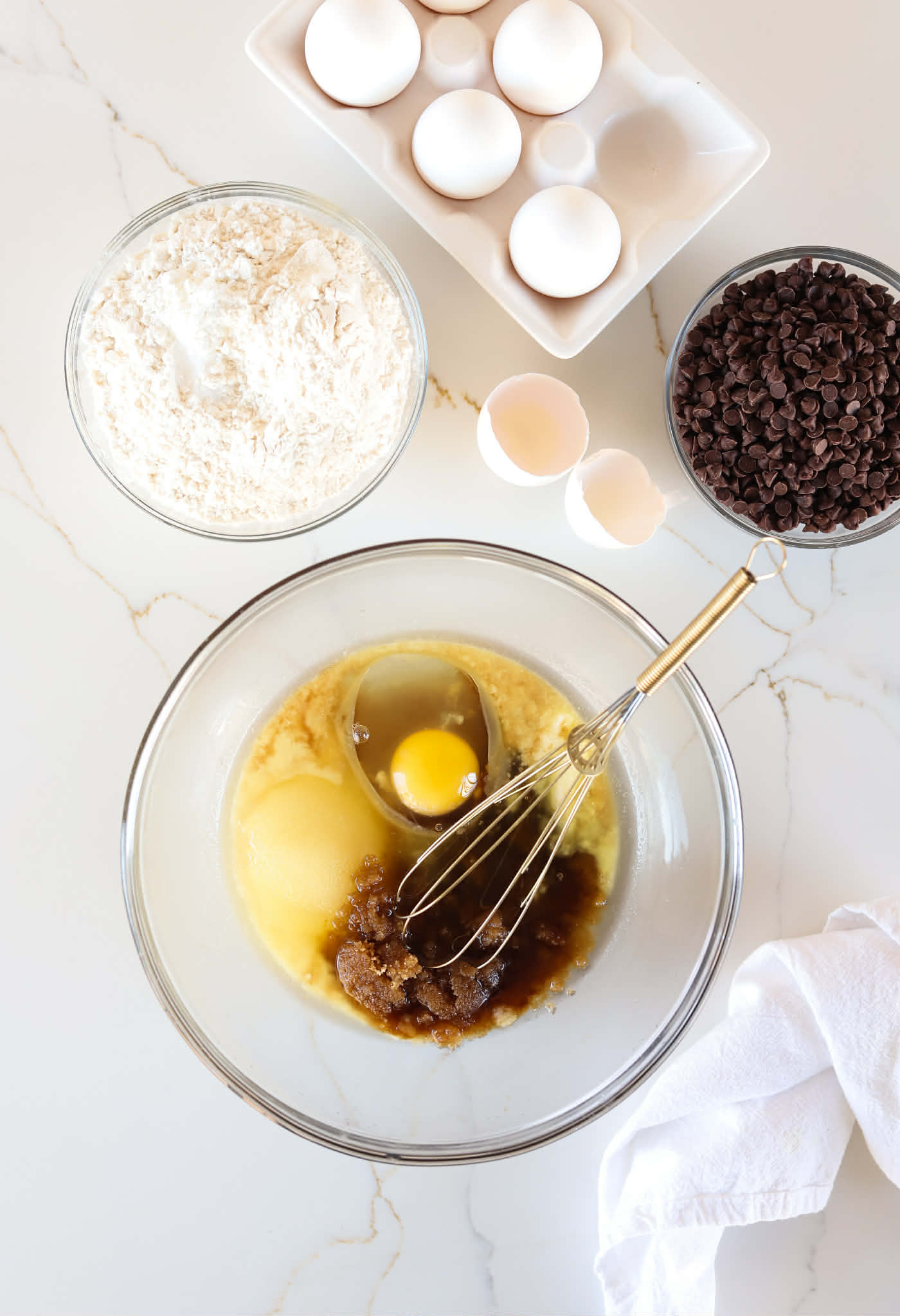 In a large bowl, whisk 1/2 cup of brown sugar and 1/4 cup of granulated sugar into 8 tablespoons of melted butter until they are completely combined. Add a large egg, an extra egg yolk and 2 teaspoons of vanilla extract and whisk until combined.