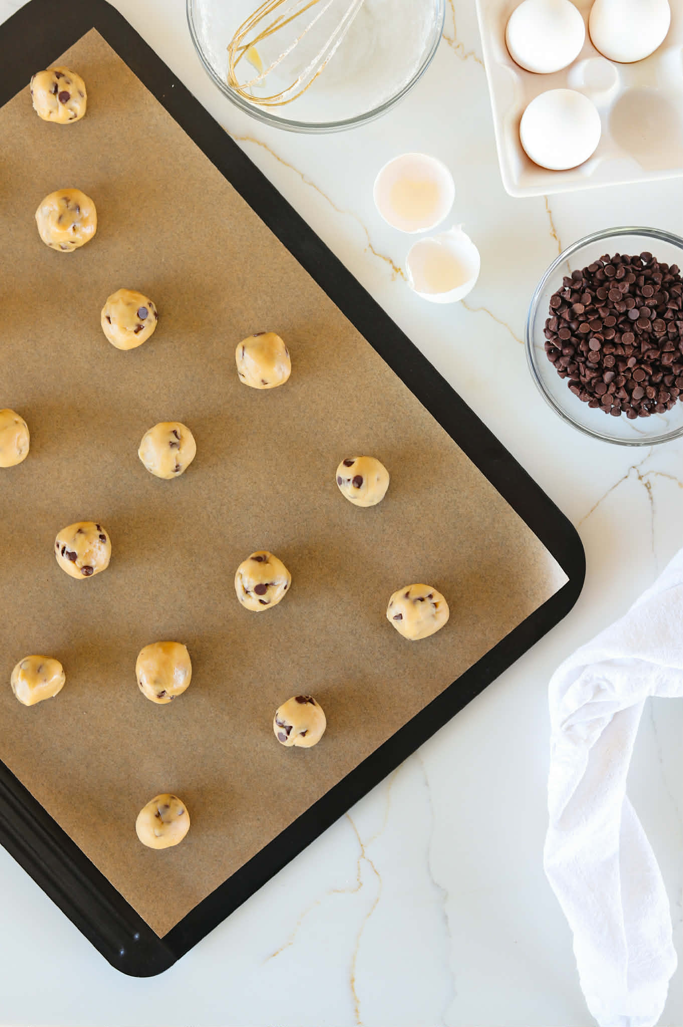 When the dough is nice and firm, transfer them onto parchment lined baking sheets leaving about an inch or a little more in between each piece to allow room for spreading. I got 48 cookies out of this recipe and was able to divide the dough balls between 3 large baking sheets.