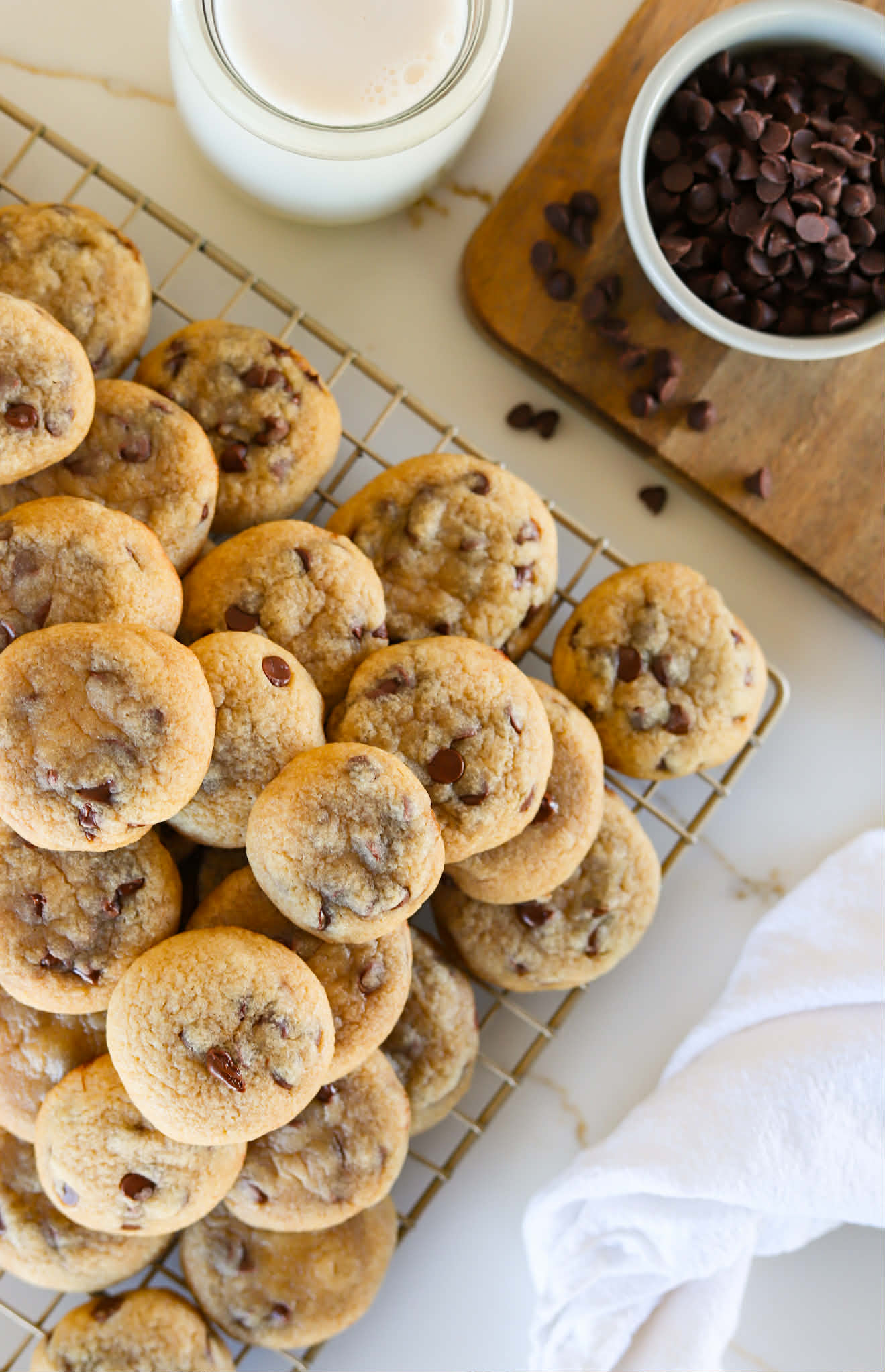 I have always been a fan of little things. I have a tiny little dog, I have collection of mini tools stowed away in a tiny little tool box in the garage (its adorable) and I have always felt that there is something fun about eating little things. Whether its little peach crostini or the tiny acini di pepe pasta in Italian wedding soup, I am a big fan of little things and these cute little chocolate chip cookies definitely fall into that category…