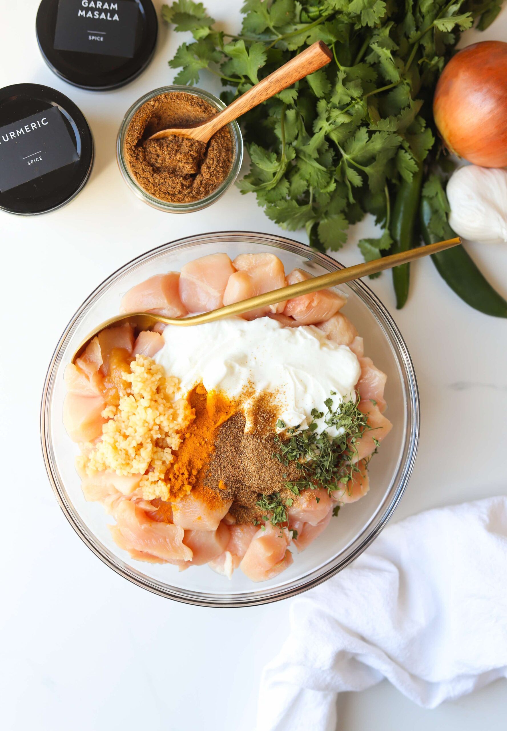 In a large bowl, combine 2 pounds of chopped boneless skinless chicken breasts or thighs with 5.3 ounces of plain greek yogurt (or a heaping 1/2 cup), 2 cloves of finely minced garlic, a teaspoon of ginger paste, 1/2 teaspoon of salt, 1/2 teaspoon of turmeric, 1/2 teaspoon of garam masala, 1/2 teaspoon of ground coriander and a teaspoon of dried fenugreek leaves. Mix until all of the chicken is coated and then chill for 4 hours or overnight.