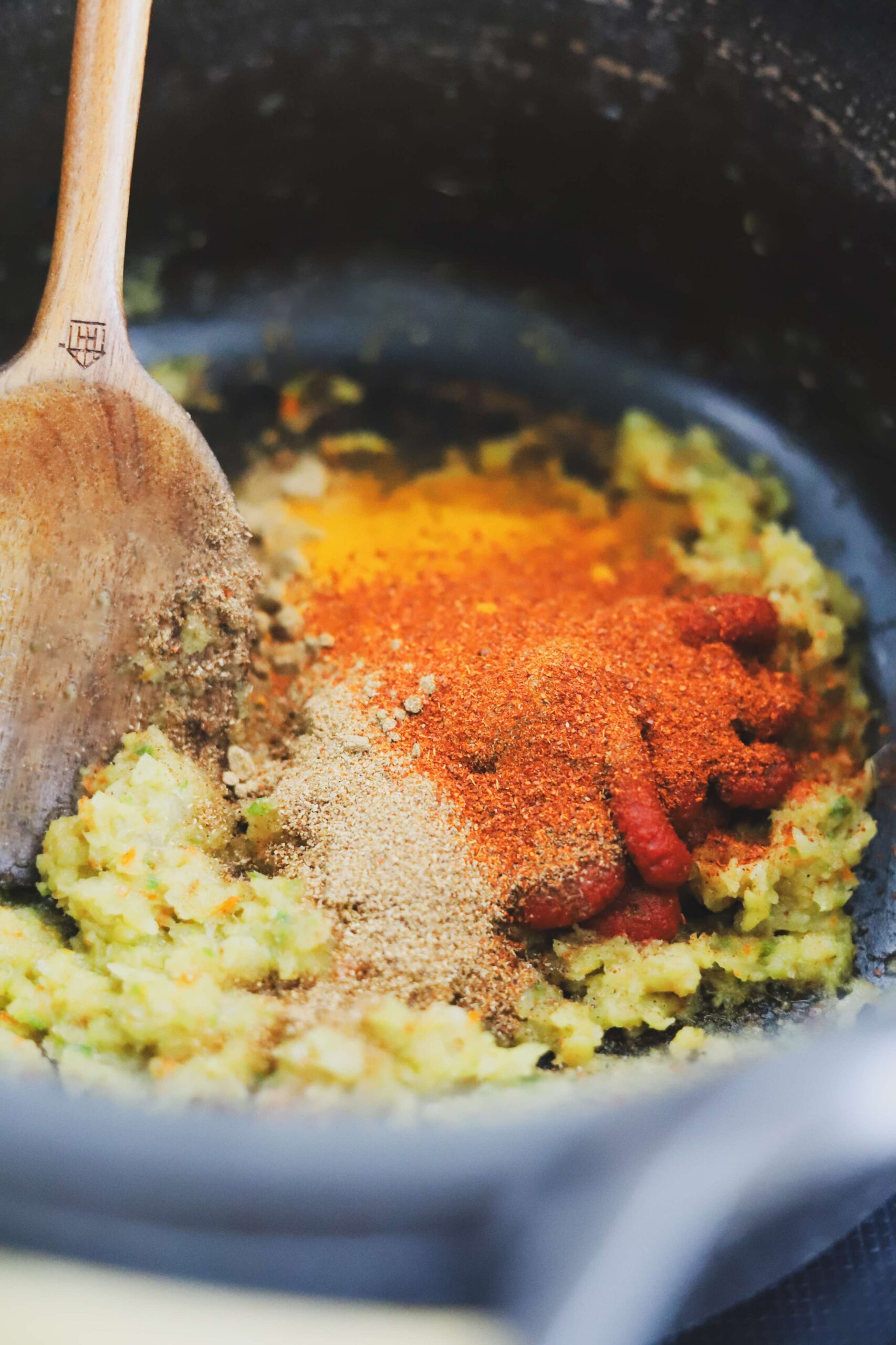 Next, add 3 tablespoons of tomato paste, 2 tablespoons of garam masala, 1 tablespoon of ground coriander, 1 tablespoon of ground cumin, 1 tablespoon of turmeric and 1 teaspoon of kashmiri chili powder and give everything a good mix. This mixture should feel like a thick paste at this point. Cook, while stirring, for a few minutes to allow the mixture to thicken and develop a deeper color.