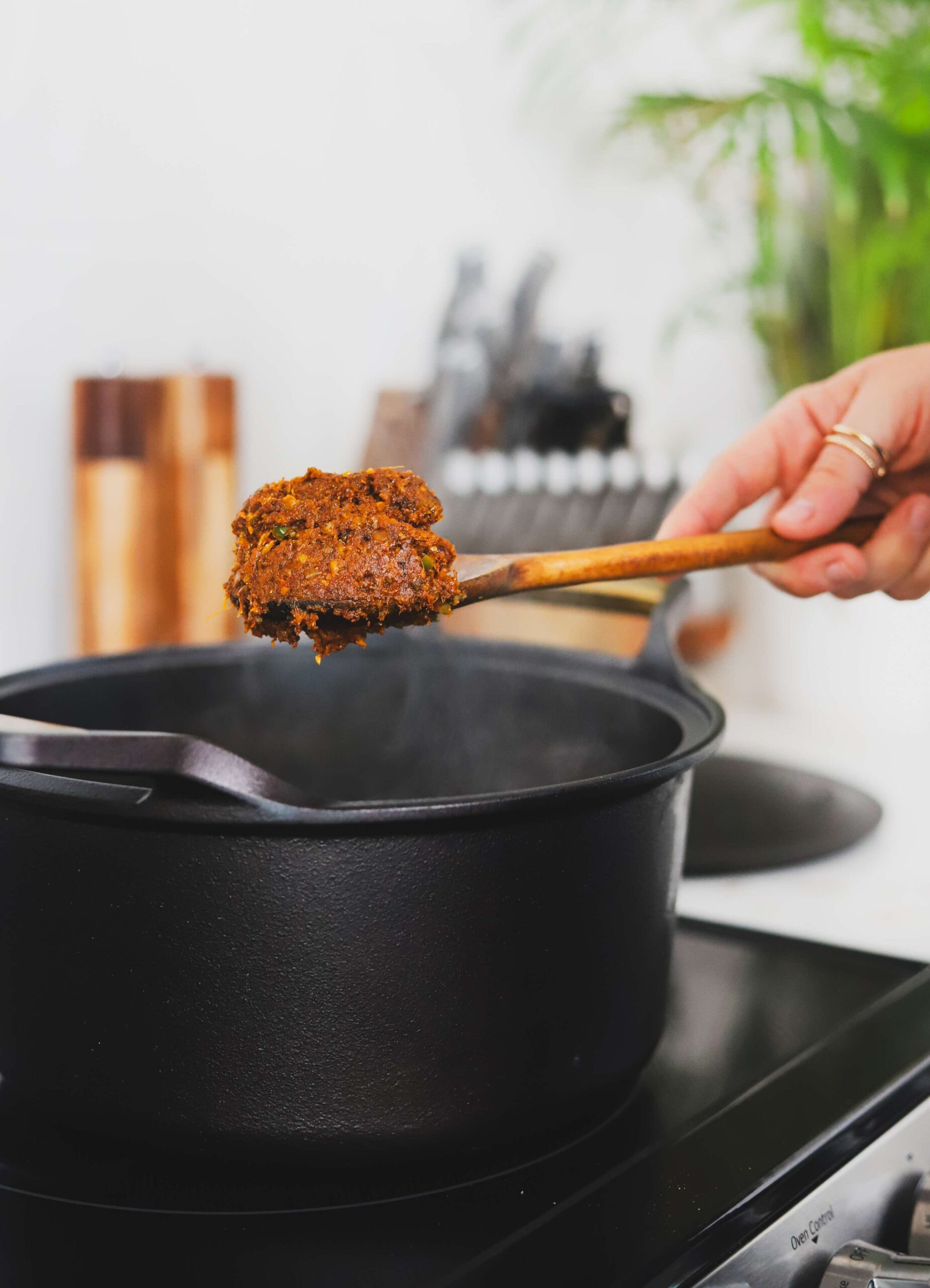 The photo above is the consistency you are looking for before moving onto the next step. Depending on what type of pot you are using (I highly recommend cast iron) and your stovetops heat, this should take around 3 minutes. I recommend waiting until the paste is a deep brick red color before moving on. The caramelization process is what will really develop those beautiful curry flavors in the end.