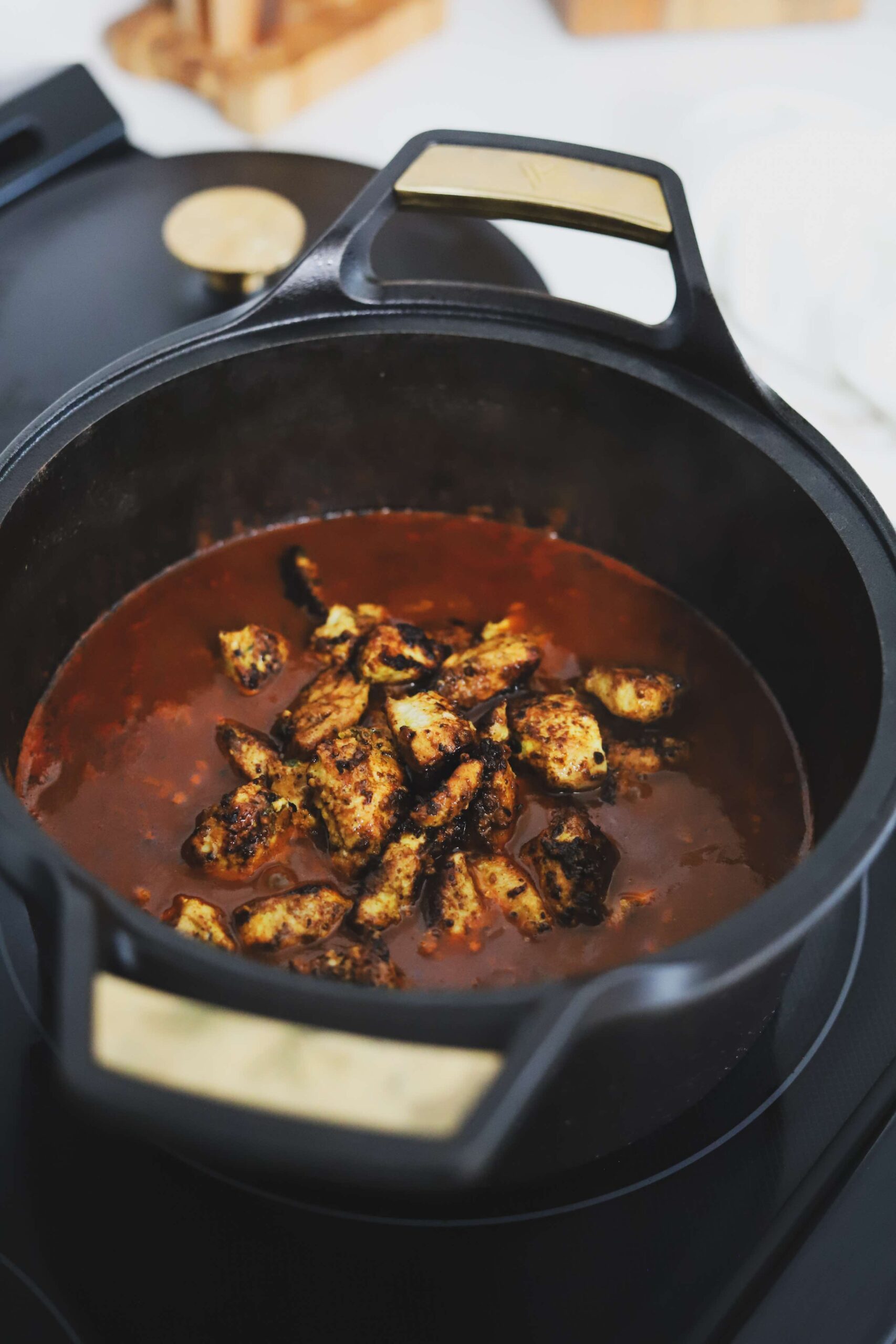 Place a large pot over medium to medium high heat and brown the marinated chicken in some neutral oil on both sides. I usually need to do this in 2 or 3 batches. As the chicken is cooked through, transfer it into the sauce and repeat the process until all of the chicken has been seared and cooked through and is now simmering in the sauce.
