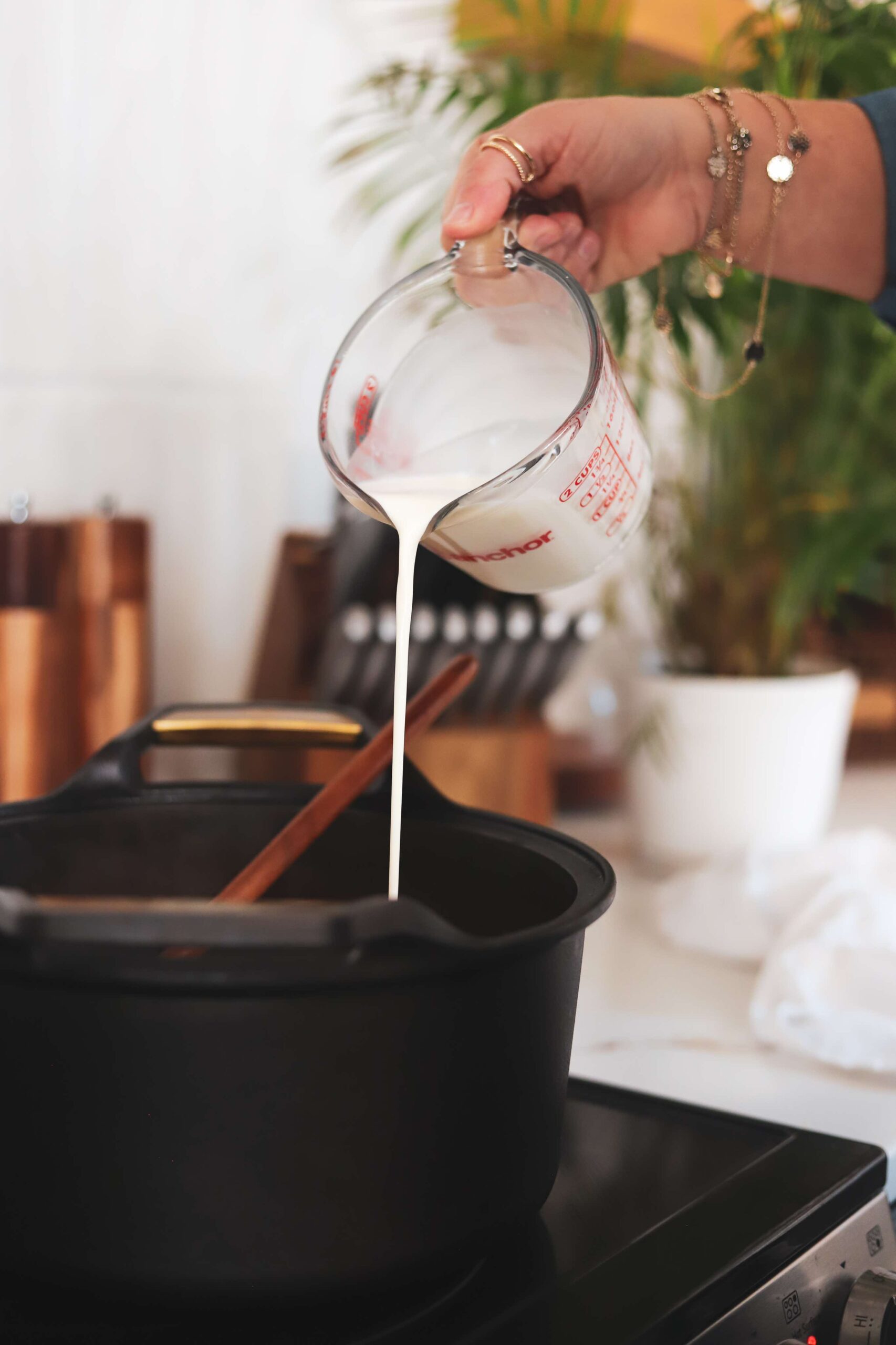 Let the chicken simmer in the sauce for about 5 minutes or however long it takes you to clean your skillet and then add 1 1/2 cups of heavy cream and 4 tablespoons of butter into the pot. Simmer until the butter has melted and the color of your curry lifts to a deep orange.
