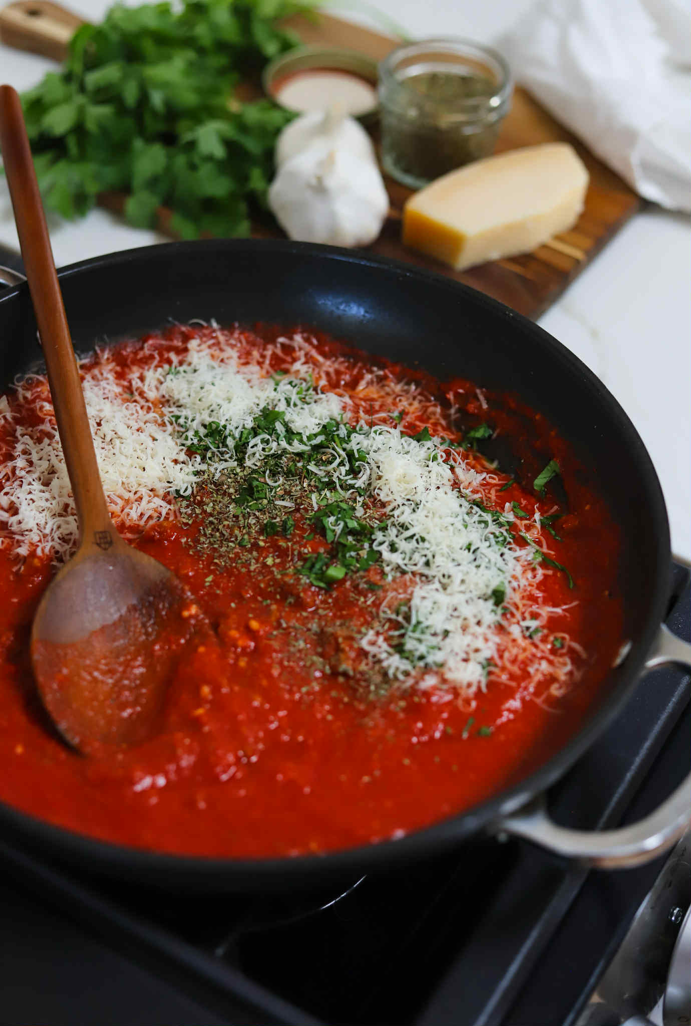Add 28 ounces of crushed tomatoes (any Italian crushed tomatoes either plain or with basil is great here!), 1/2 cup of fresh shredded parmesan, about 2 tablespoons of fresh finely chopped parsley, a teaspoon of dried Italian herbs and some additional sea salt and black pepper. Bring the mixture to a simmer and let it cook until you are ready to serve.