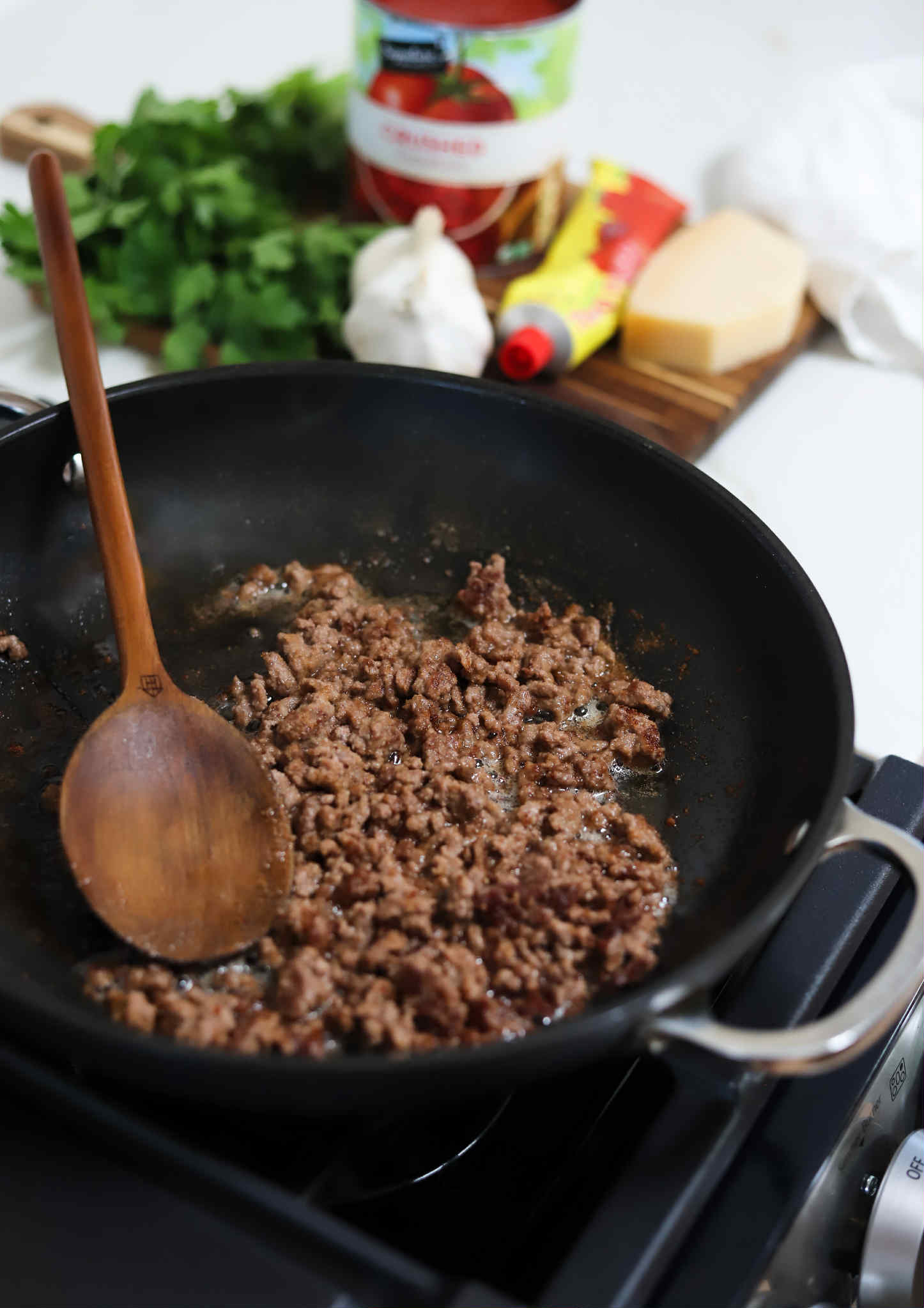- Brown 8 ounces of ground beef, pork or lamb in a skillet and season with sea salt, black pepper and your favorite Italian spice blend