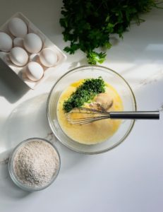 Next, whisk in 1/4 cup of finely chopped fresh dill and parsley, 1 teaspoon of salt, 1 teaspoon of garlic powder, 1 teaspoon of onion powder, 1/2 teaspoon of baking powder and 1/4 teaspoon of black pepper.