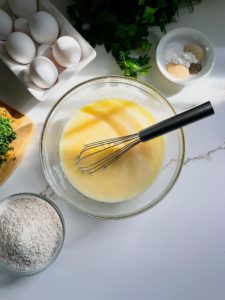 - Whisk 5 large eggs with 1/4 cup of schmaltz or melted butter and 1/4 cup of club soda in a large bowl